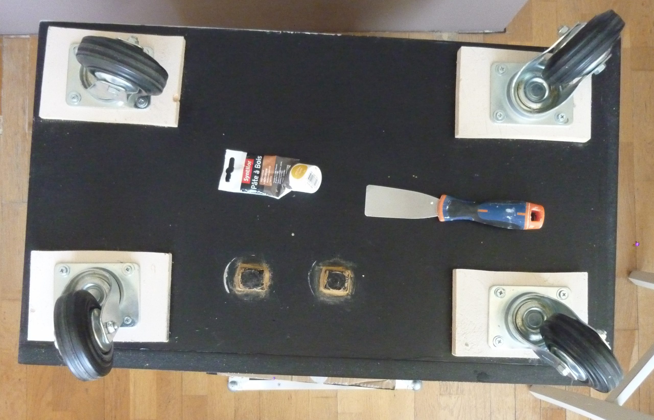Je construit, aussi, un petit plateau de MDF15 entre les roues et le subwoofer